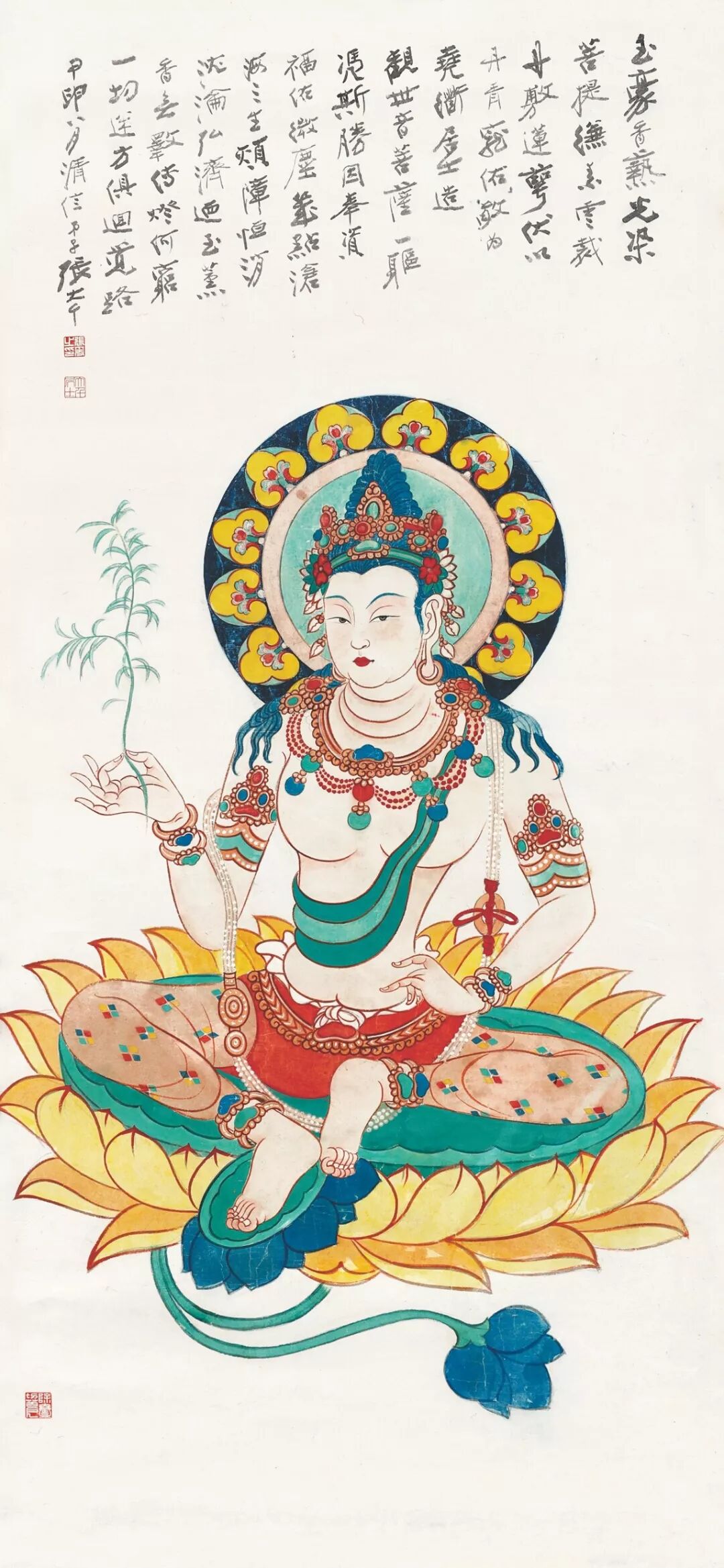 玉豪香爇。光染菩提。缣素云裁。丹敷莲萼。伏以丹青宠佑。敬为尧衢居士造观世音菩萨一躯。凭斯胜因。奉资福佑。微尘几点。沧海三生。烦障恒消。沉沦弘济。廼至薰香无斁。传灯何穷。一切迷方。具回觉路。甲申 八月。清信弟子张大千。