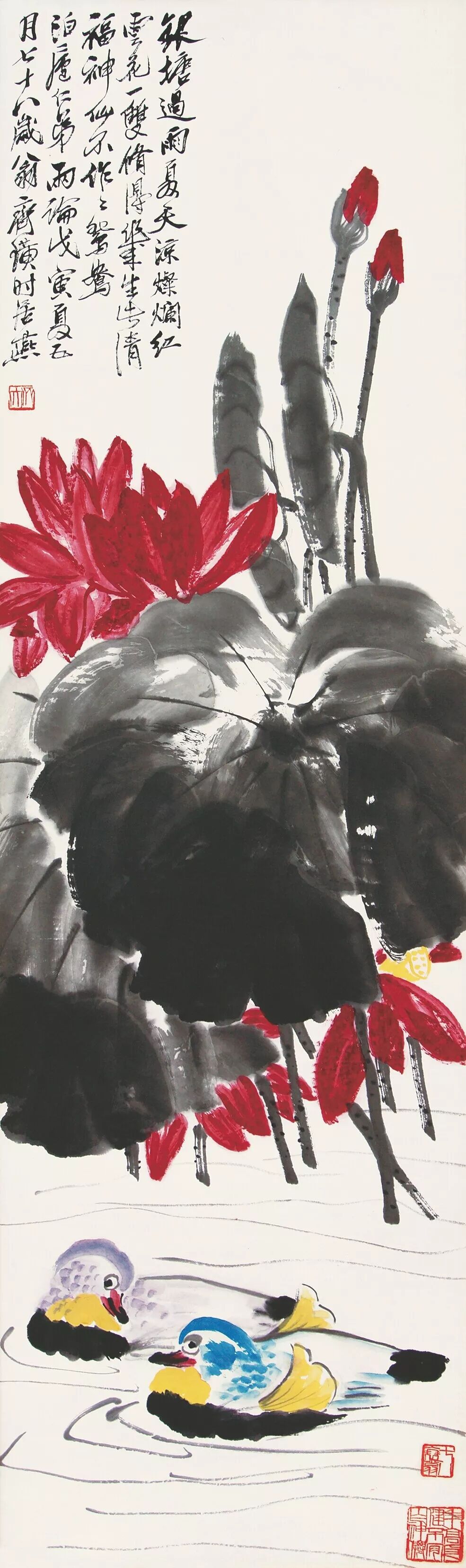 银塘过雨夏天凉。灿烂红云花一双。脩得几生此清福。神仙不作作鸳鸯。泊庐仁弟两论。戊寅夏五月。七十八岁翁。齐璜。时居燕。
